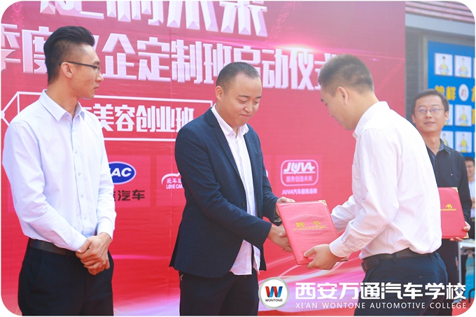 其中,西安萬通汽車學校校區(qū)主任、創(chuàng)就業(yè)中心主任以及陜西奧特森江淮4S店尚勇總經(jīng)理、靚車牛人汽車美容服務連鎖龍科宇總監(jiān)等領導出席本次啟動儀式。